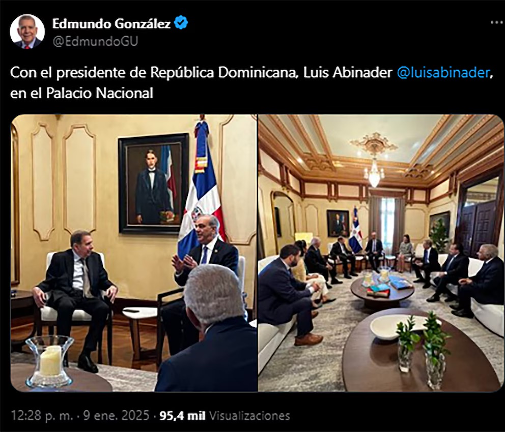 El líder opositor venezolano compartió en la red social X imágenes del encuentro, acompañadas por el mensaje: “Con el presidente de República Dominicana, Luis Abinader, en el Palacio Nacional”. Este encuentro forma parte de una gira internacional que lo ha llevado por varios países de América, incluyendo Argentina, Uruguay, Estados Unidos y Panamá, en su búsqueda por consolidar apoyo diplomático tras los controvertidos comicios venezolanos.