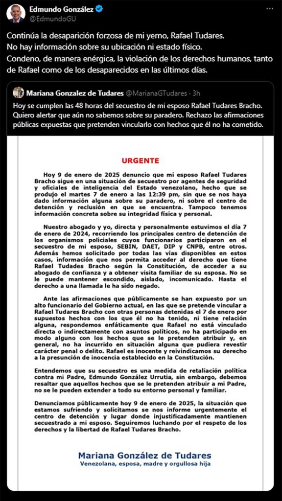 En un comunicado difundido por su hija, Mariana González de Tudares, se afirma que Rafael no tiene ninguna conexión con asuntos políticos y se recalca que su desaparición tiene motivaciones políticas dirigidas a intimidar al presidente electo. Mariana expresó: “Rafael es inocente y reivindicamos su derecho a la presunción de inocencia establecida por la Constitución”. También denunció que las autoridades venezolanas han impedido cualquier tipo de contacto con su esposo, violando derechos fundamentales establecidos en la legislación venezolana.